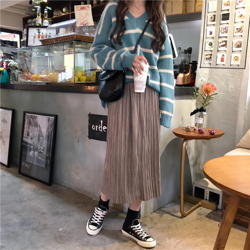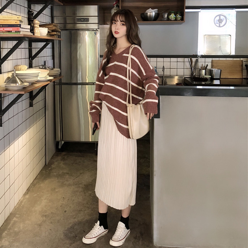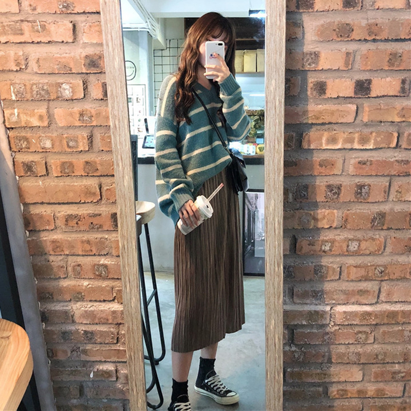 / 毛衣配裙子兩件套女秋冬新款寬松V領條紋毛衣高腰百褶A字半身裙子