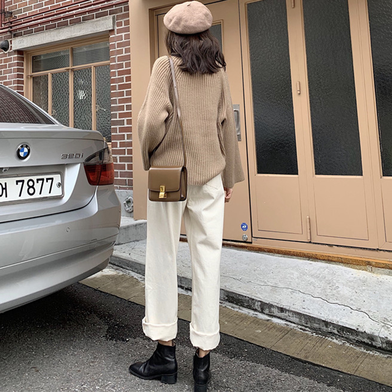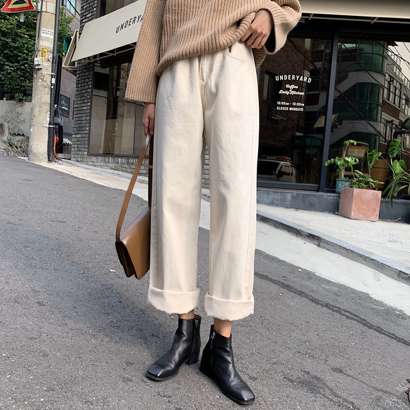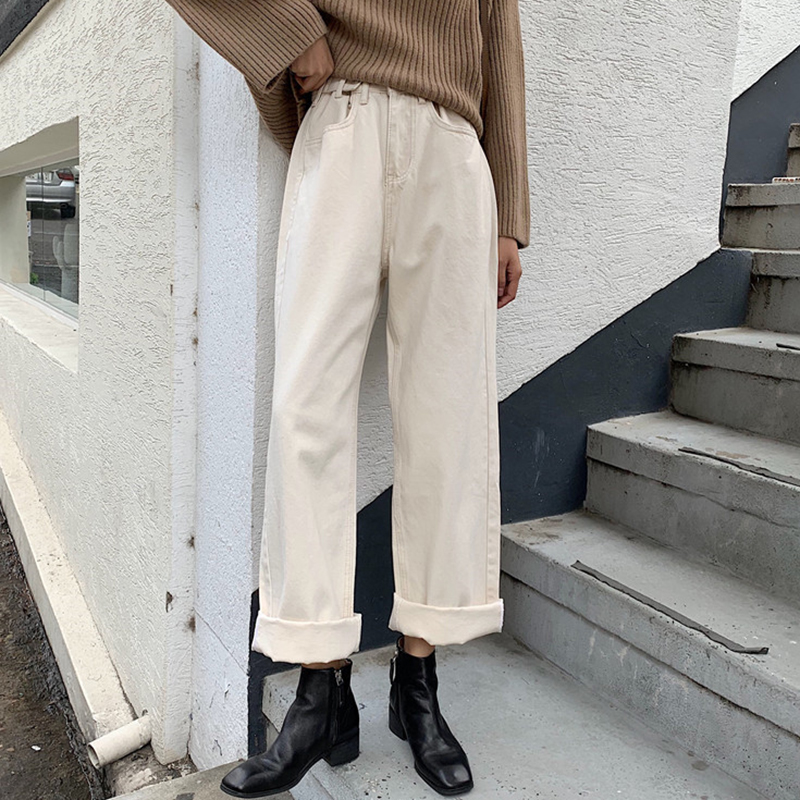 / 韓版純色高腰顯瘦復古牛仔褲女秋冬裝新款學生寬松初戀闊腿長褲子