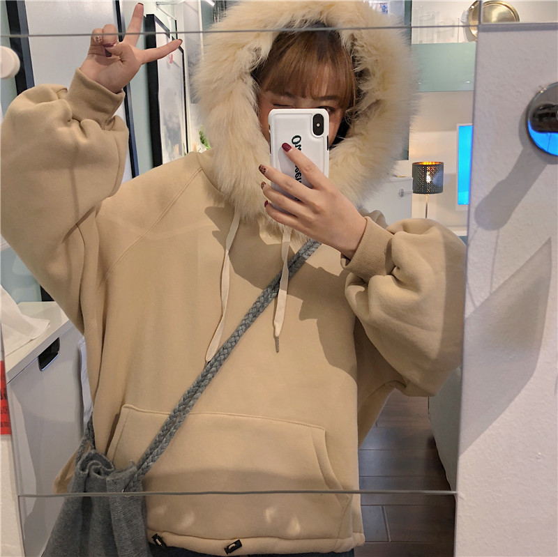 2018新款秋冬女裝韓版寬松毛領連帽加厚加絨套頭超火衛衣上衣外套