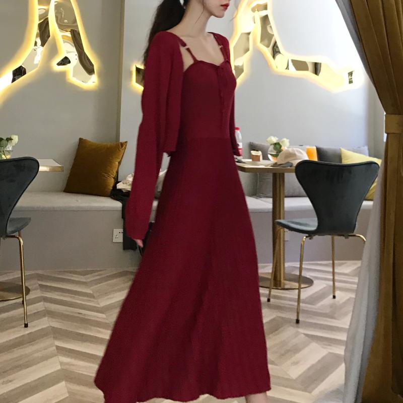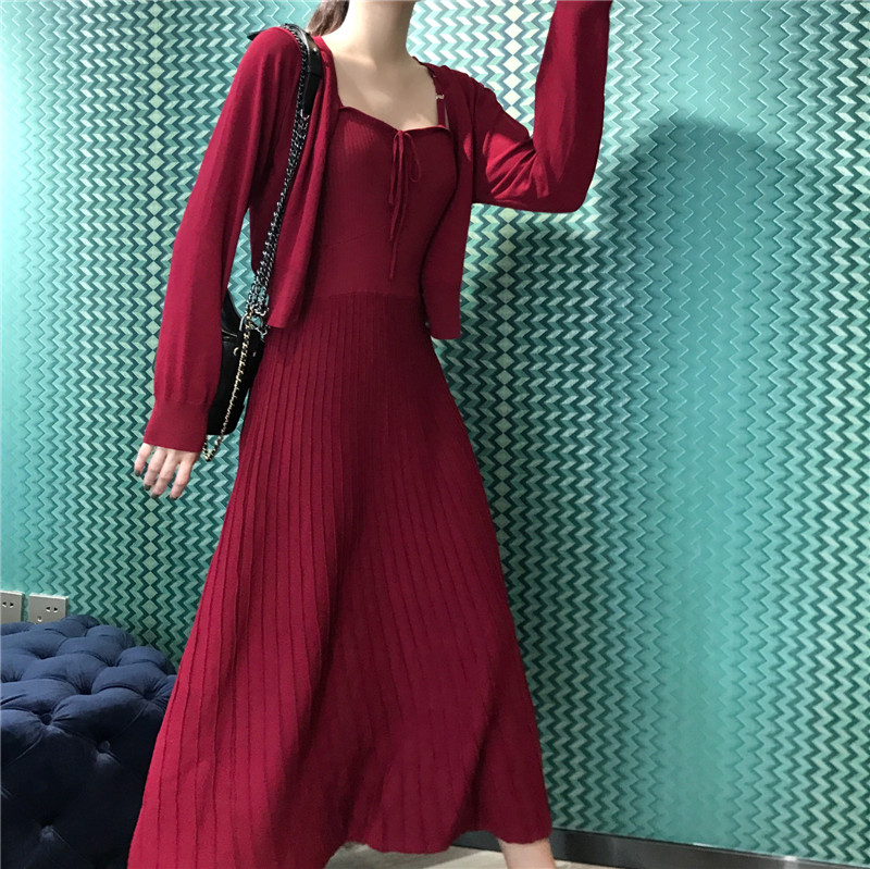 秋裝女2018新款套裝時尚酒紅色針織開衫外套+吊帶連衣裙分開拍