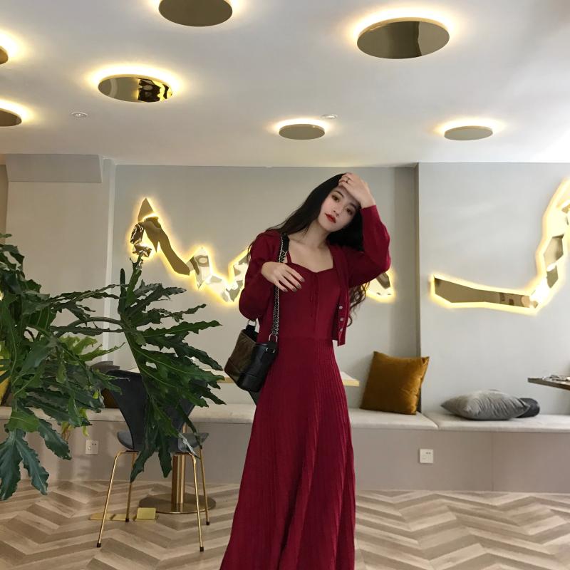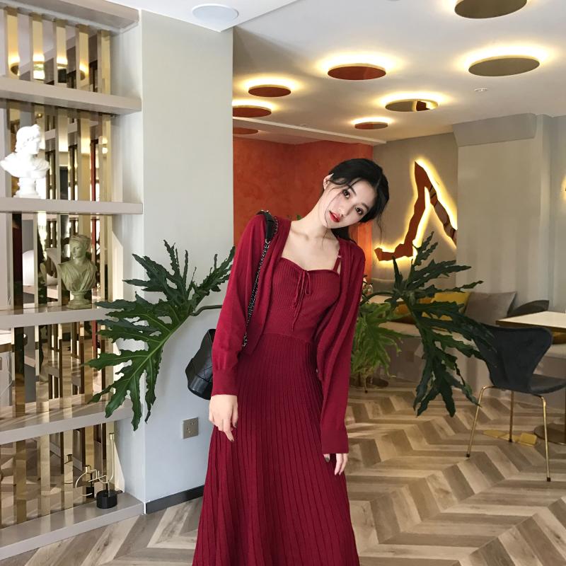 / 秋裝女2018新款套裝時尚酒紅色針織開衫外套+吊帶連衣裙分開拍