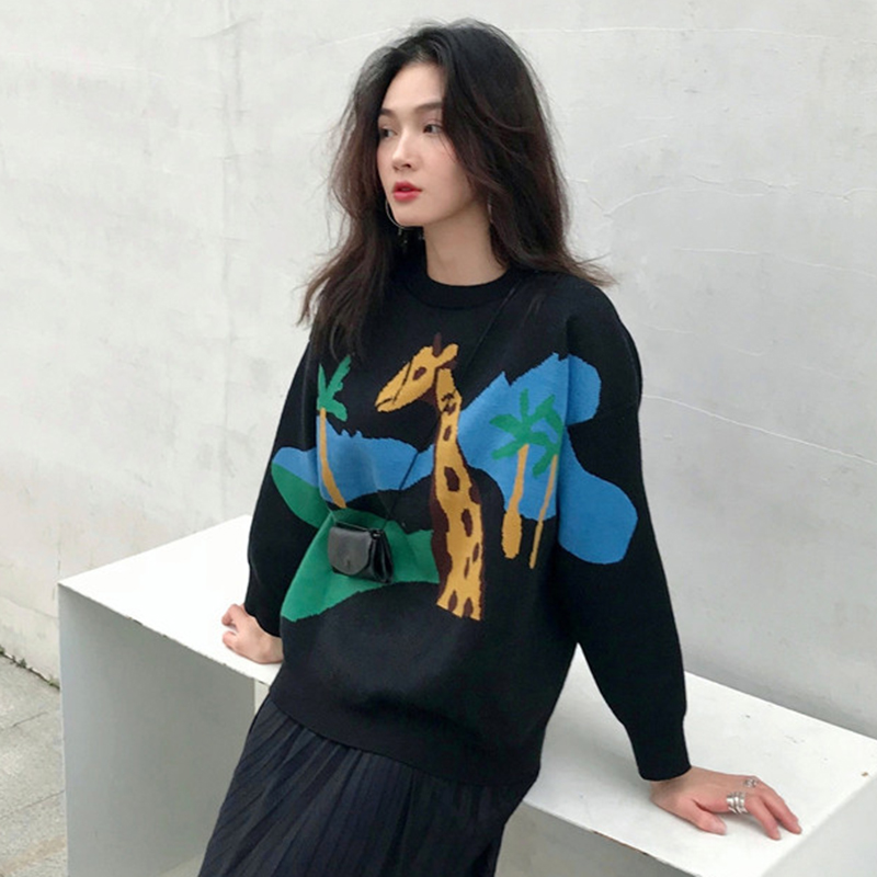 學生圓領寬松針織外套女秋冬裝新款韓版卡通慵懶毛衣時尚長袖上衣