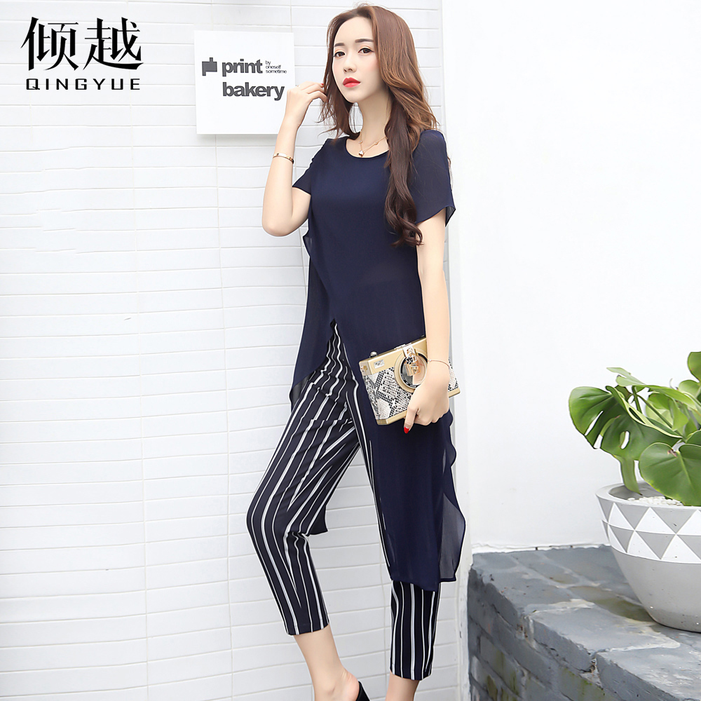 / 傾越2017新款夏季女裝復古歐洲站套裝時尚韓版條紋九分褲兩件套潮