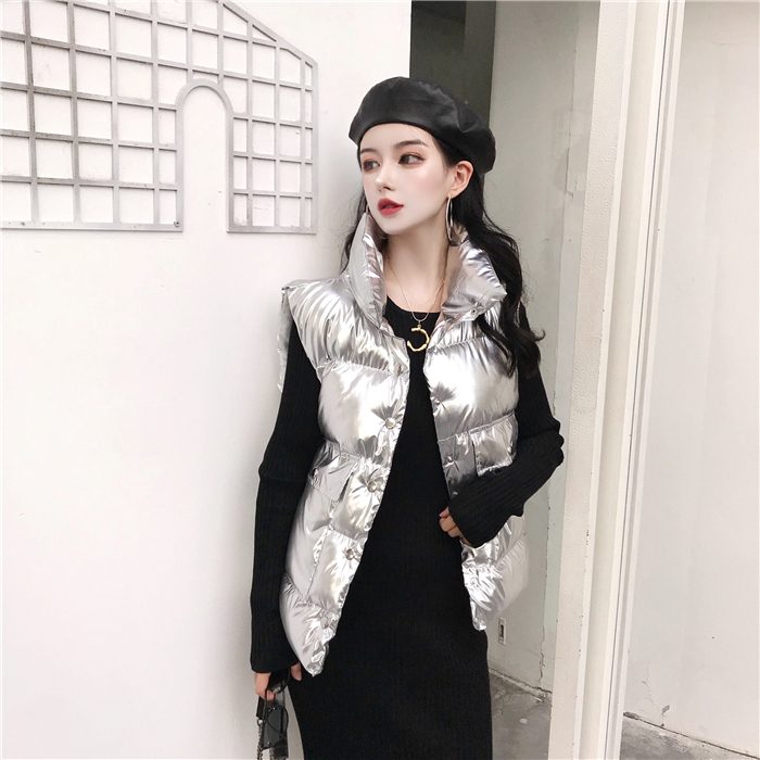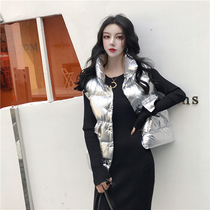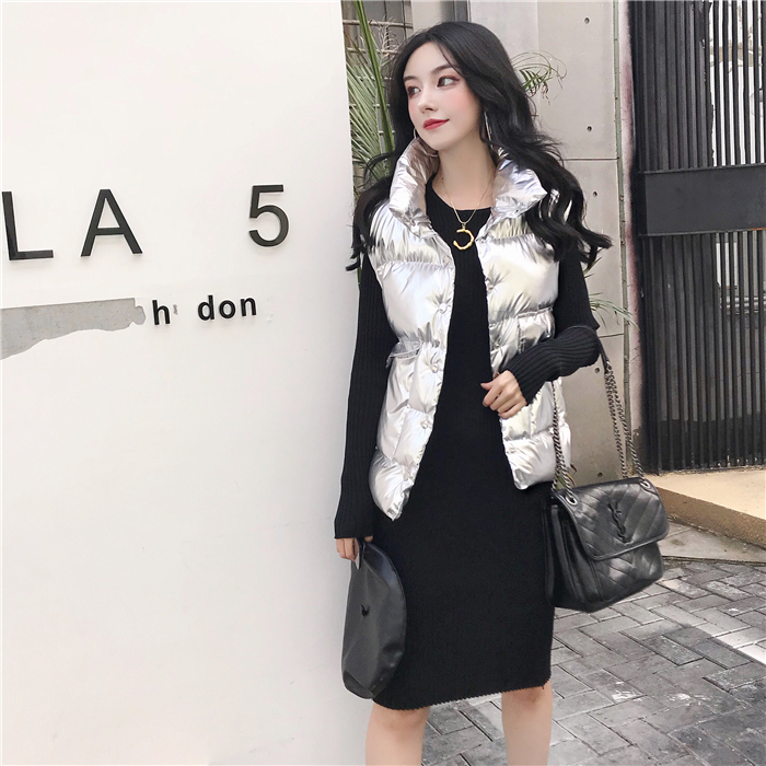 秋裝女2018新款時尚套裝銀色無袖面包服棉衣+長袖厚實針織連衣裙