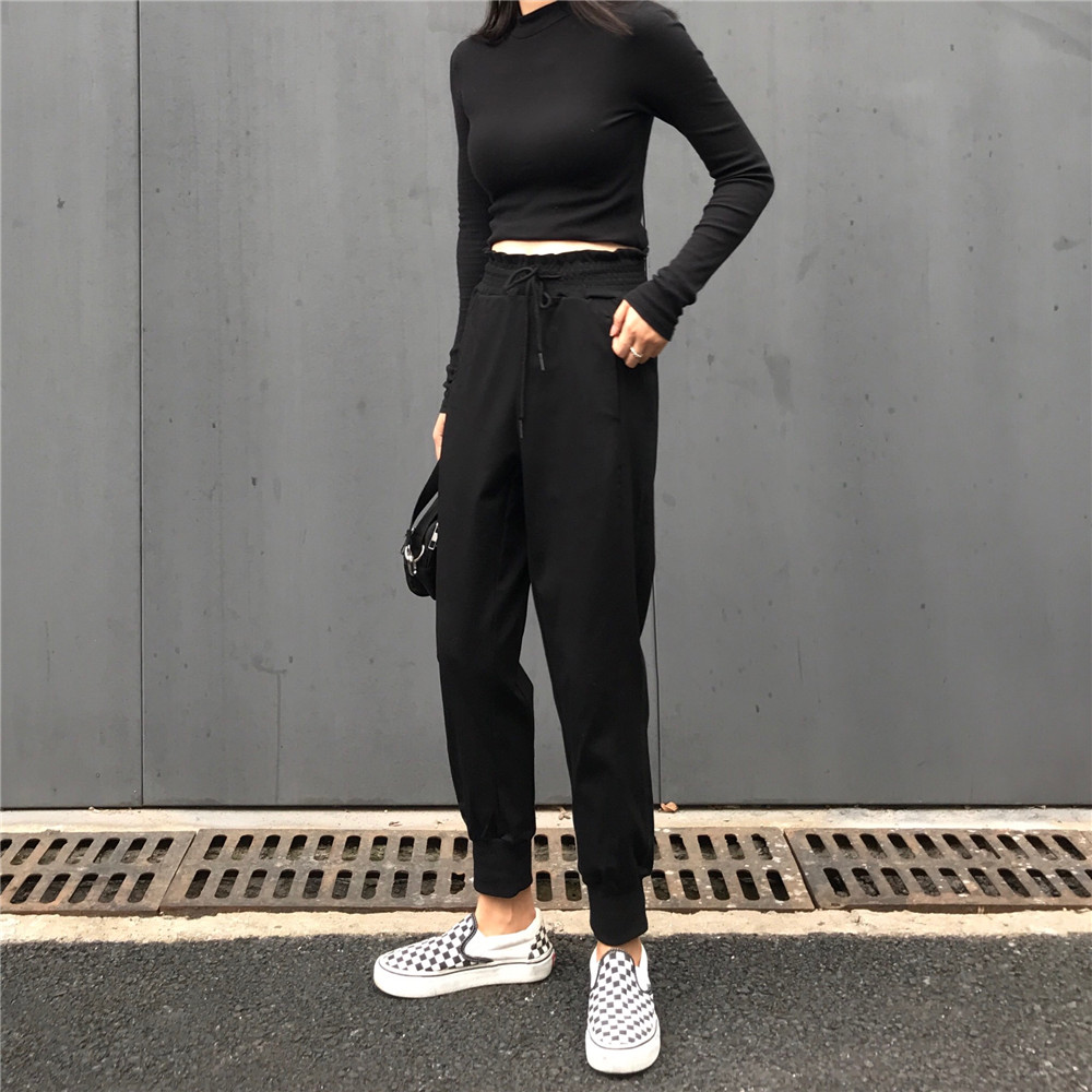 褲子女秋冬季新款復古百搭高腰顯瘦小腳九分褲哈倫褲系帶休閑衛褲