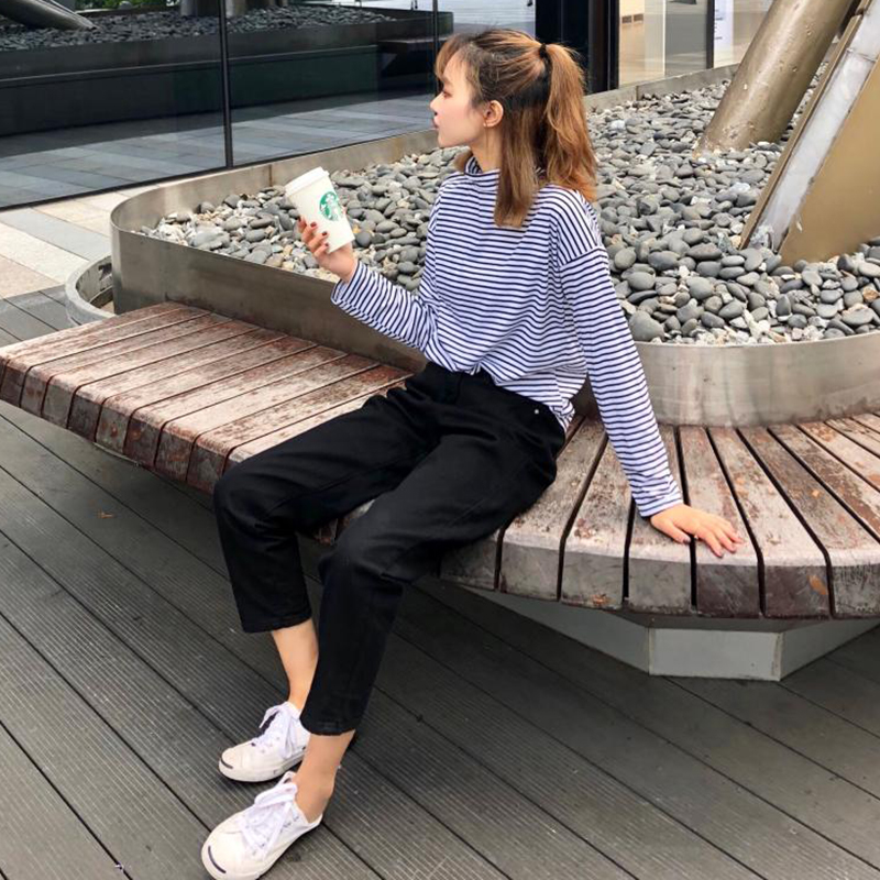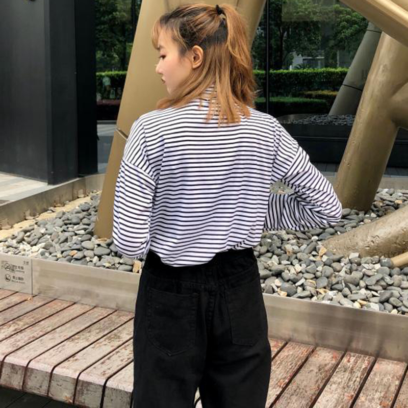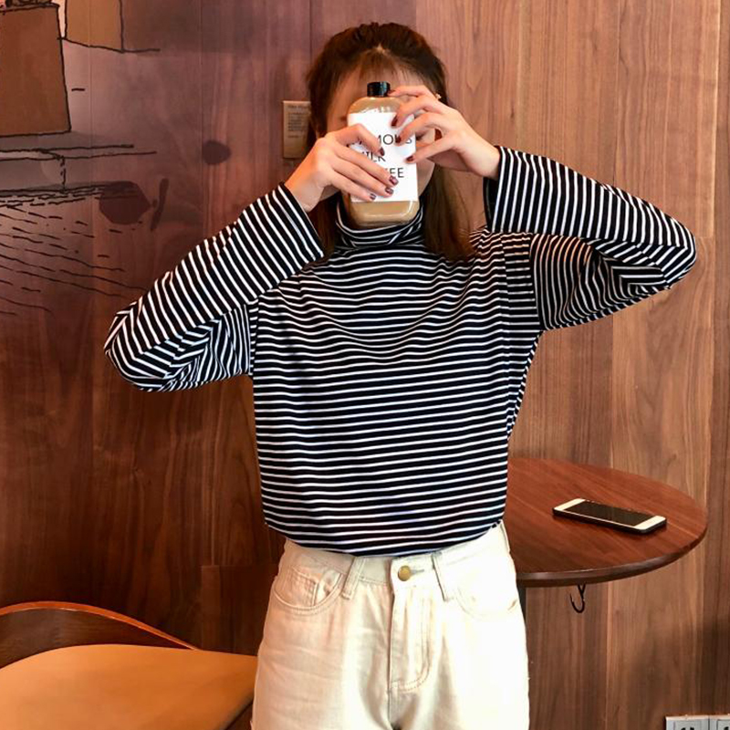 時尚條紋高領T恤秋裝女2018新款韓版學生休閑上衣百搭長袖打底衫