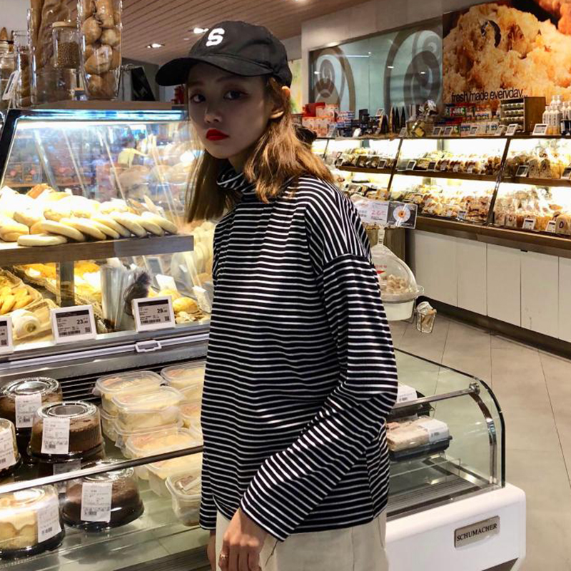 / 時尚條紋高領T恤秋裝女2018新款韓版學生休閑上衣百搭長袖打底衫