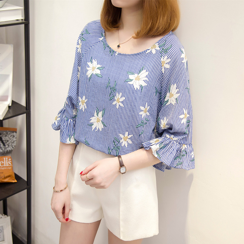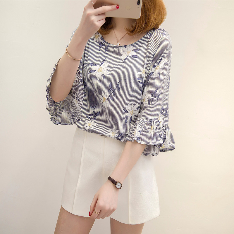 夏裝新款條紋襯衫女寬松韓風chic半袖襯衣女小清新上衣韓范