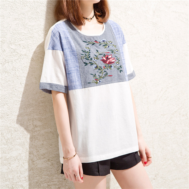 夏裝新款女寬松條紋t恤女白色韓版復古名族風小心機上衣女夏