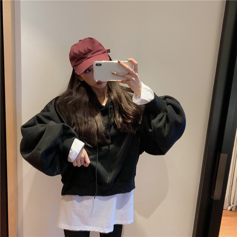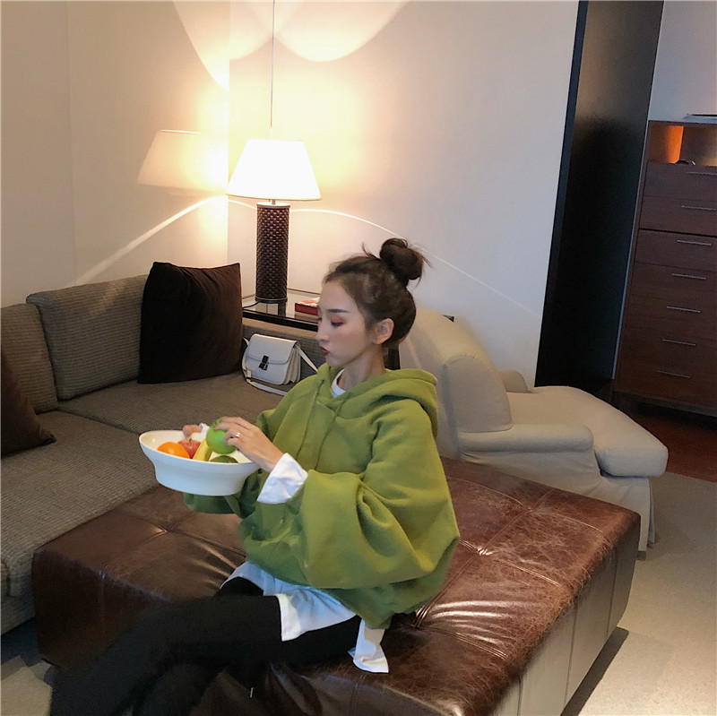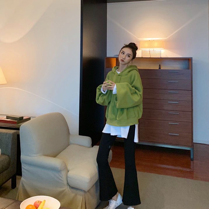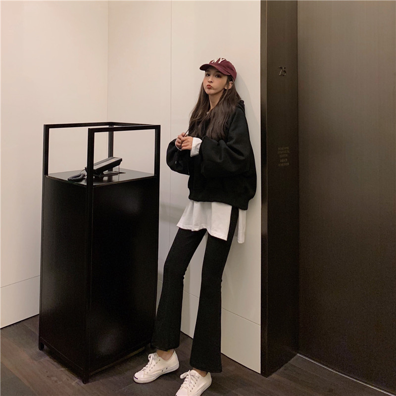 / 韓版純色百搭糖果色衛衣女+白色T恤+修身顯瘦微喇叭褲套裝三件套