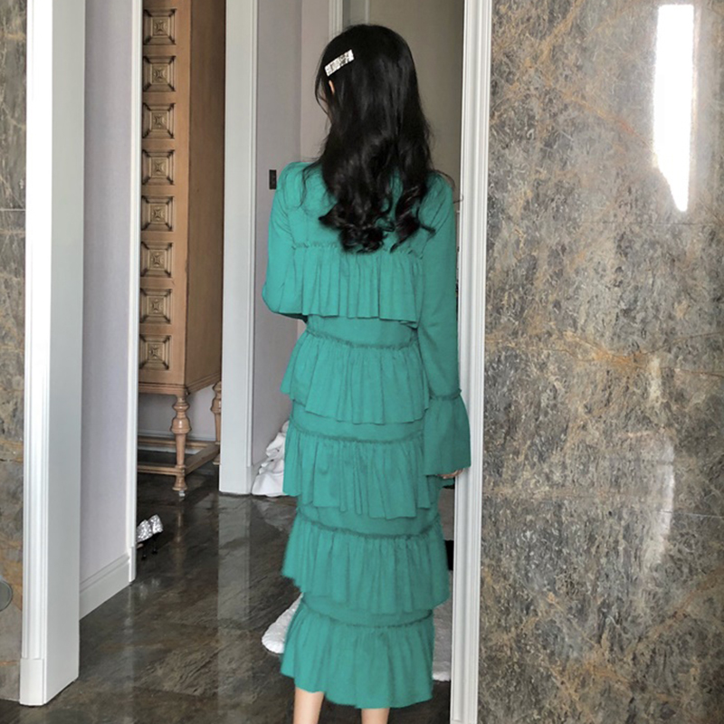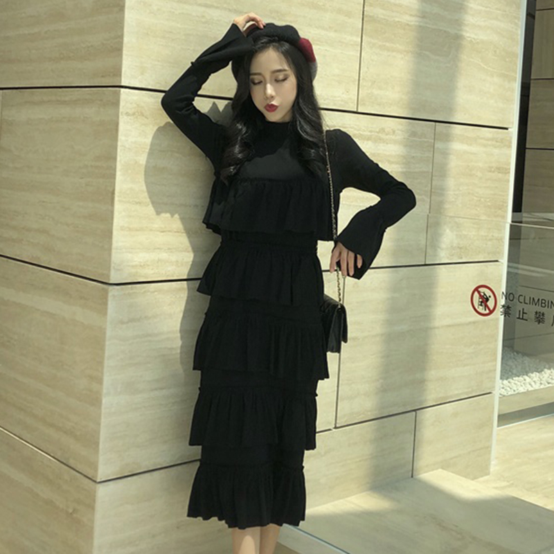 / 時尚半高領修身蛋糕裙女秋裝新款氣質喇叭長袖連衣裙學生中長裙子