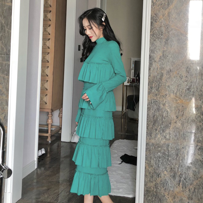 時尚半高領修身蛋糕裙女秋裝新款氣質喇叭長袖連衣裙學生中長裙子