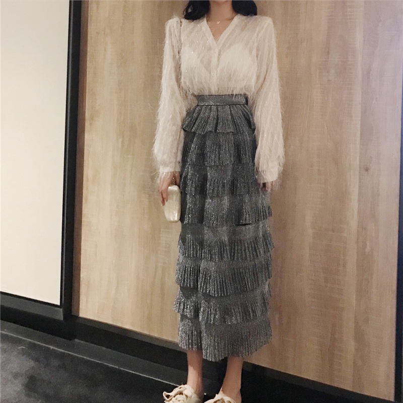 / 秋裝女2018新款套裝港味亮絲上衣+高腰閃閃亮絲半身裙時尚兩件套