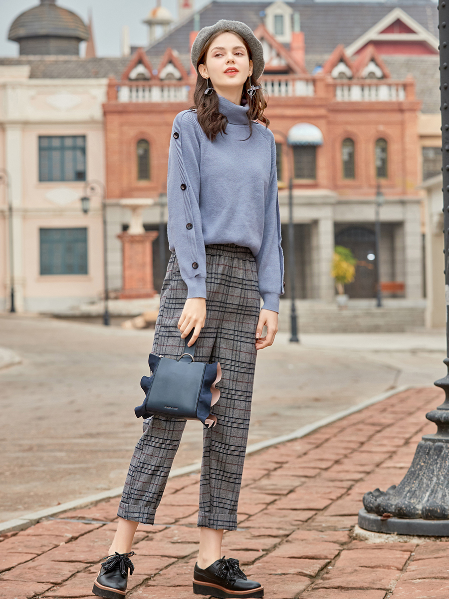 / MG小象格子高腰直筒褲女韓版寬松復古休閑褲冬季新款學生chic褲子