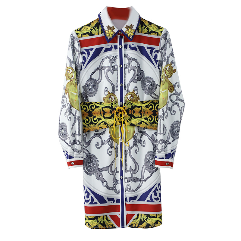 S秀淑女氣質2018秋季新款九分袖高腰系帶印花連衣裙時尚潮