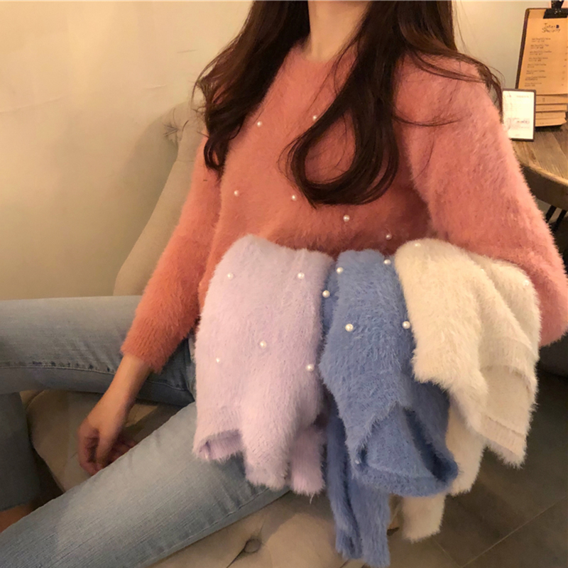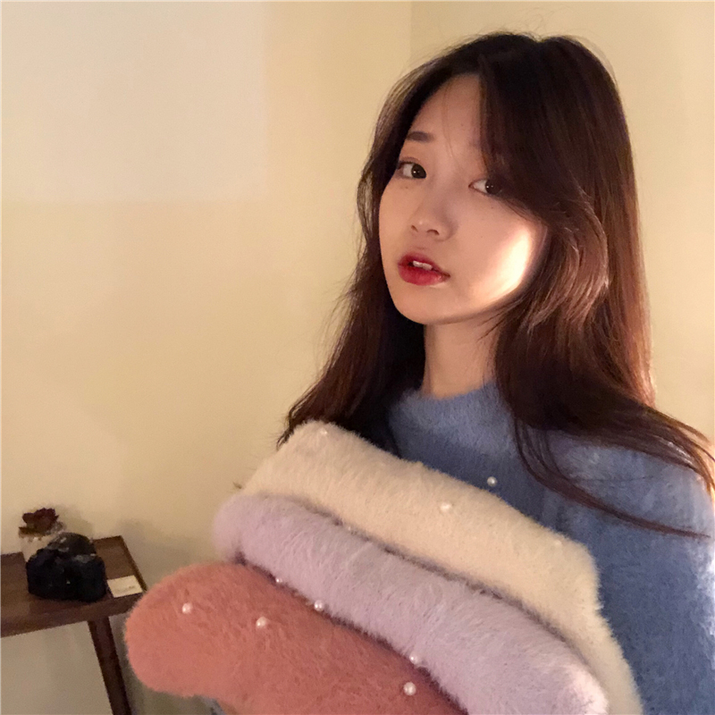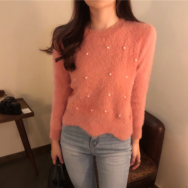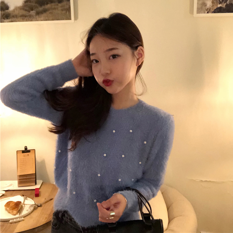 chic純色釘珍珠毛衣外套女秋冬裝2018新款韓版寬松長袖短款針織衫