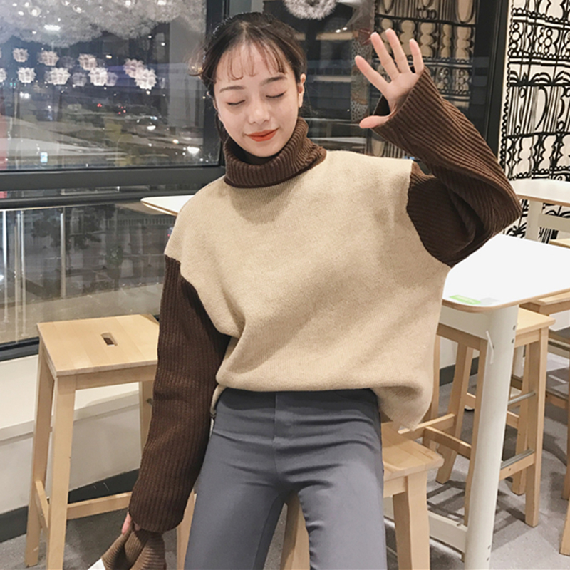 秋冬女裝2018新款韓版撞色高領套頭毛衣外套時尚百搭寬松針織衫潮