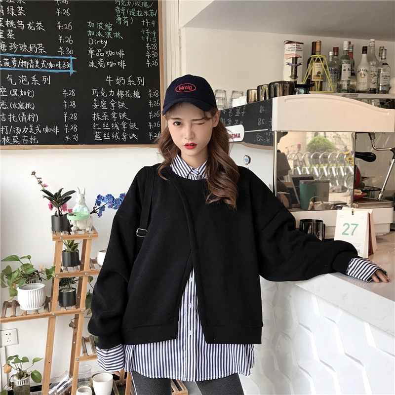 / 2018新款秋冬韓版中長款復古寬松拼接襯衫加厚套頭衛衣上衣外套女
