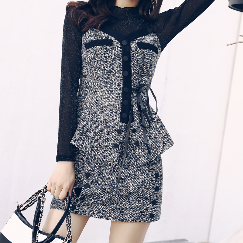 / 粗花毛呢吊帶毛衣半身包臀裙子三件套裝早秋冬打底套裙氣質名媛潮