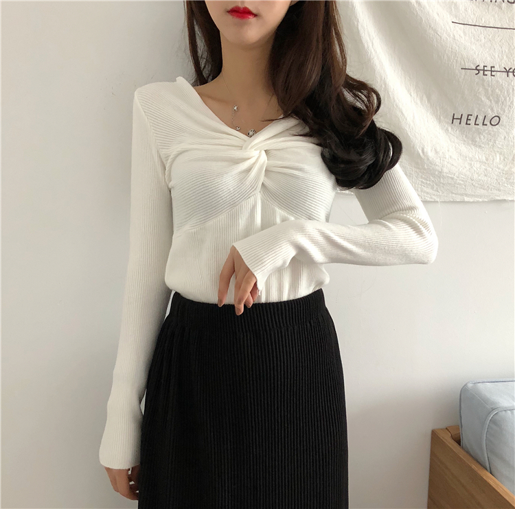 / 初秋溫柔風毛衣女長袖紐結針織衫韓版港味交叉純色打底衫修身毛衣