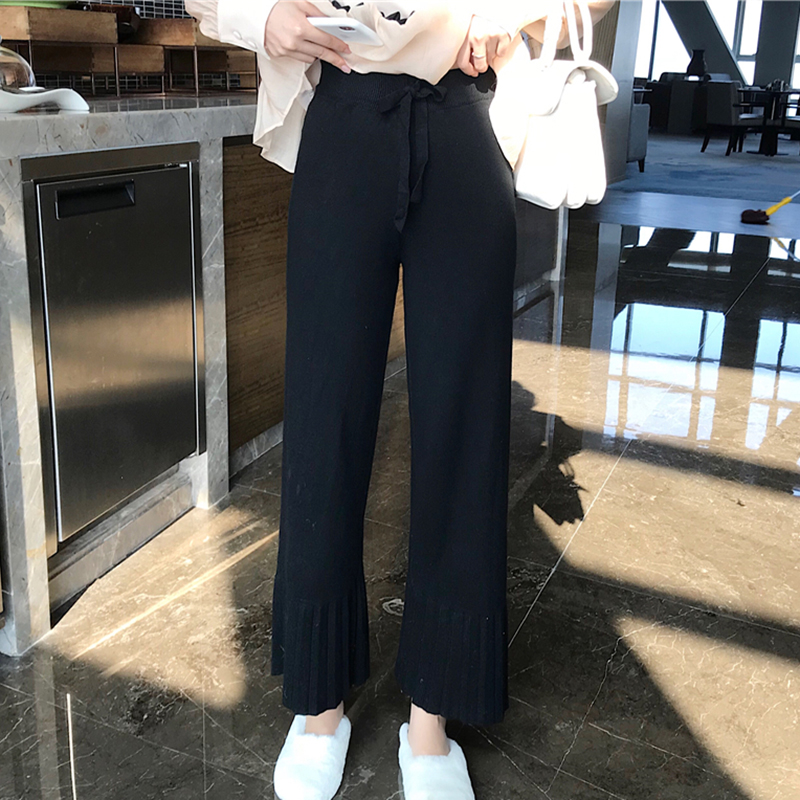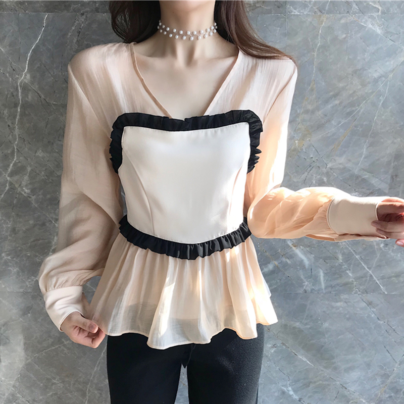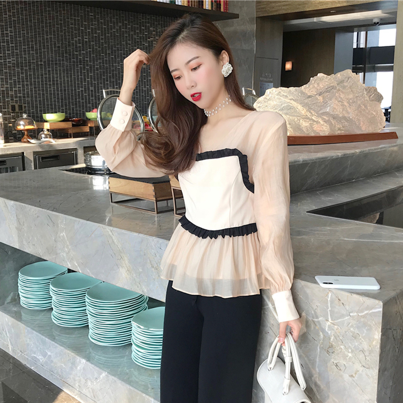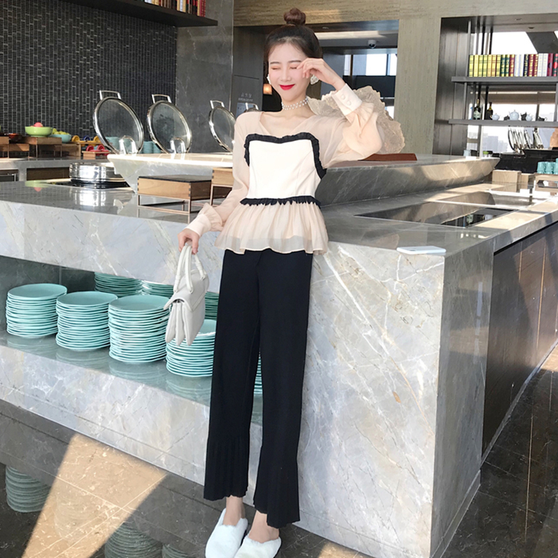 / 秋冬2018新款港味套裝女長袖雪紡襯衫上衣韓版荷葉邊九分喇叭褲子