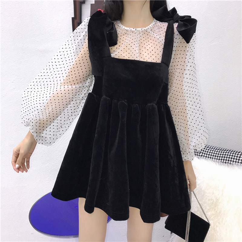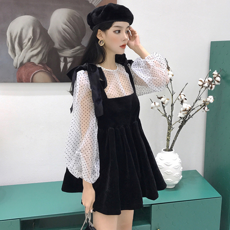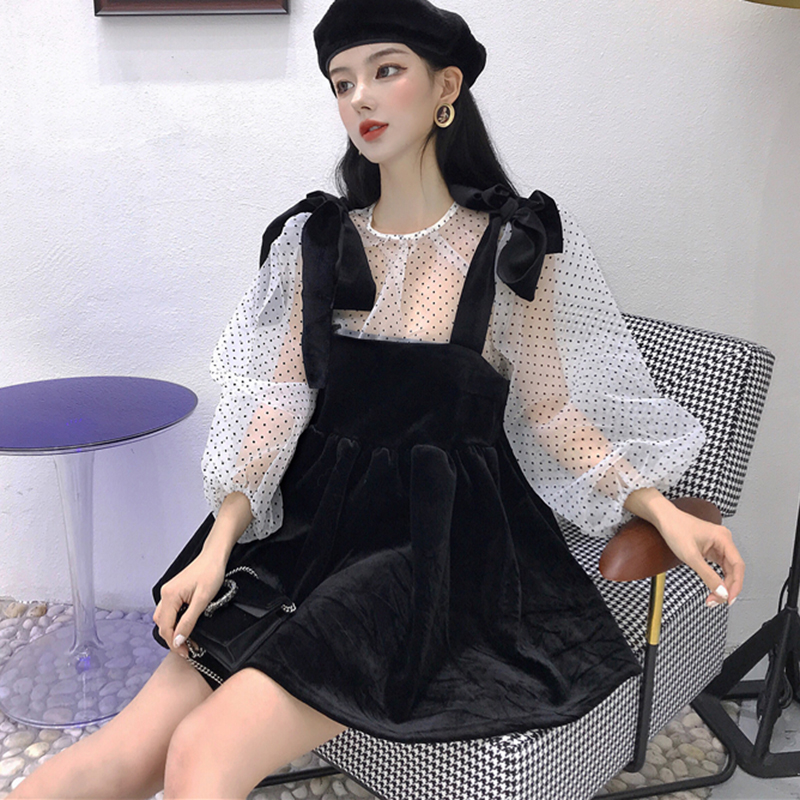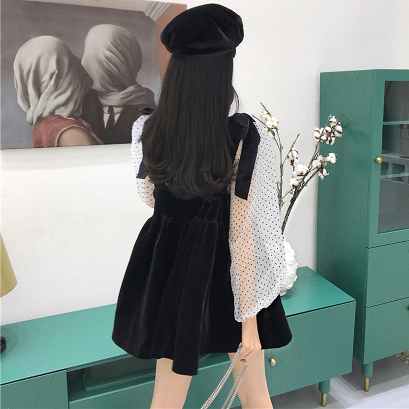 / 洋氣套裝女秋冬新款時尚波點長袖罩衫寬松系帶蝴蝶結絲絨吊帶裙子