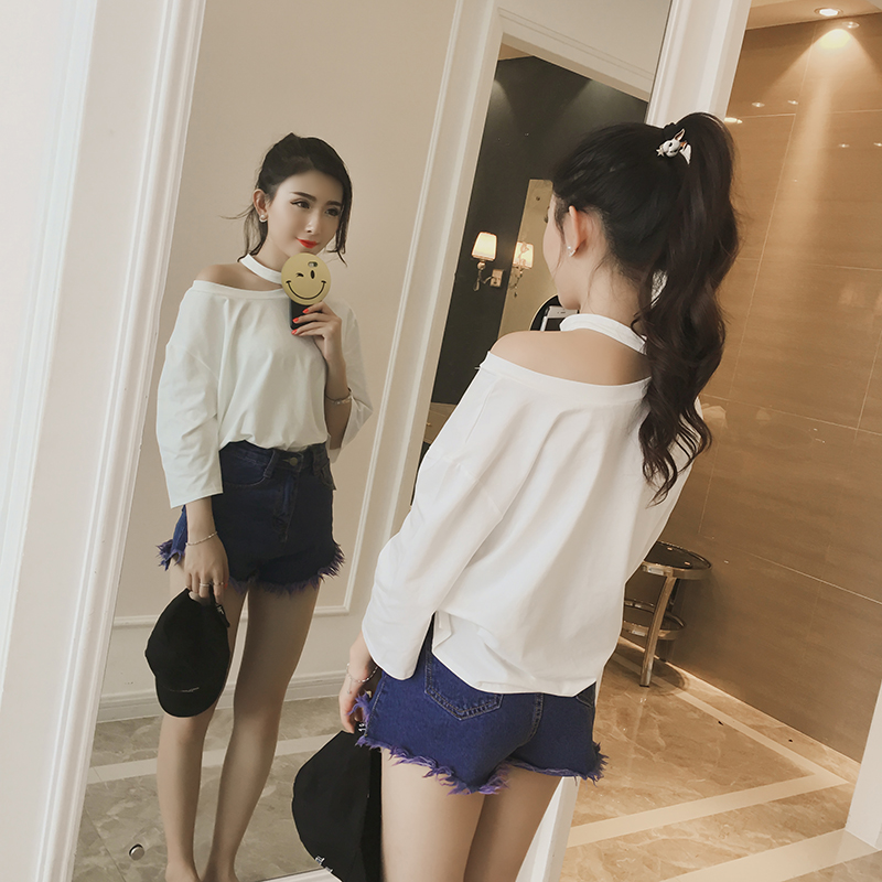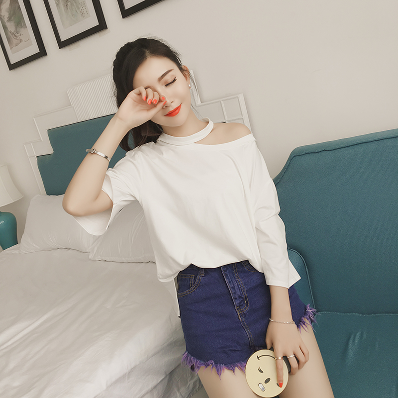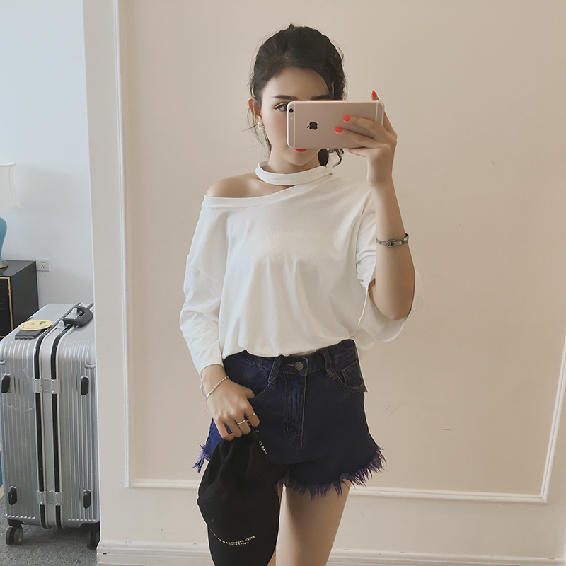 / 夏季新款韓版休閑百搭寬松七分袖斜肩破洞掛脖上衣T恤女裝