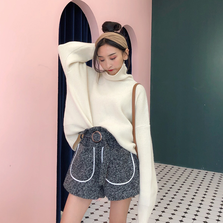 chic風韓版褲子女秋冬2018新款百搭高腰粗毛呢撞色寬松闊腿短褲潮