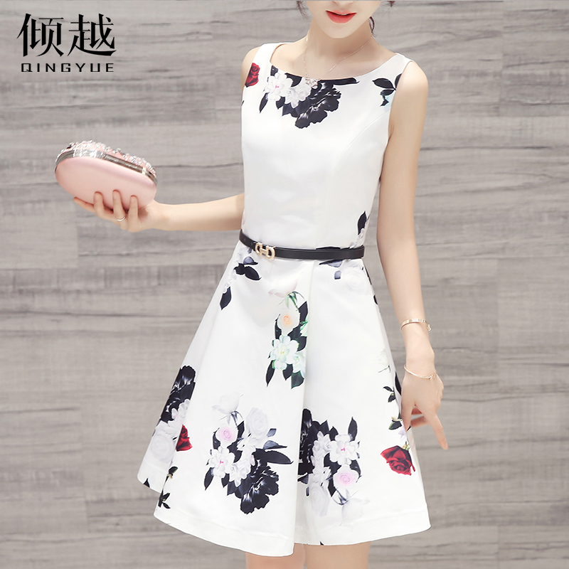 / 2017夏裝新款氣質淑女雪紡連衣裙無袖修身顯瘦束腰中長款印花裙子