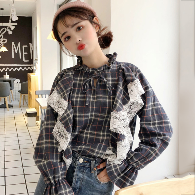 少女蕾絲荷葉邊襯衫2018秋裝新款學生甜美可愛燈籠長袖格子上衣潮