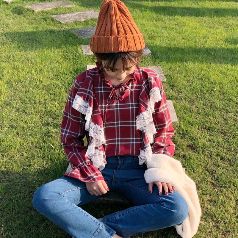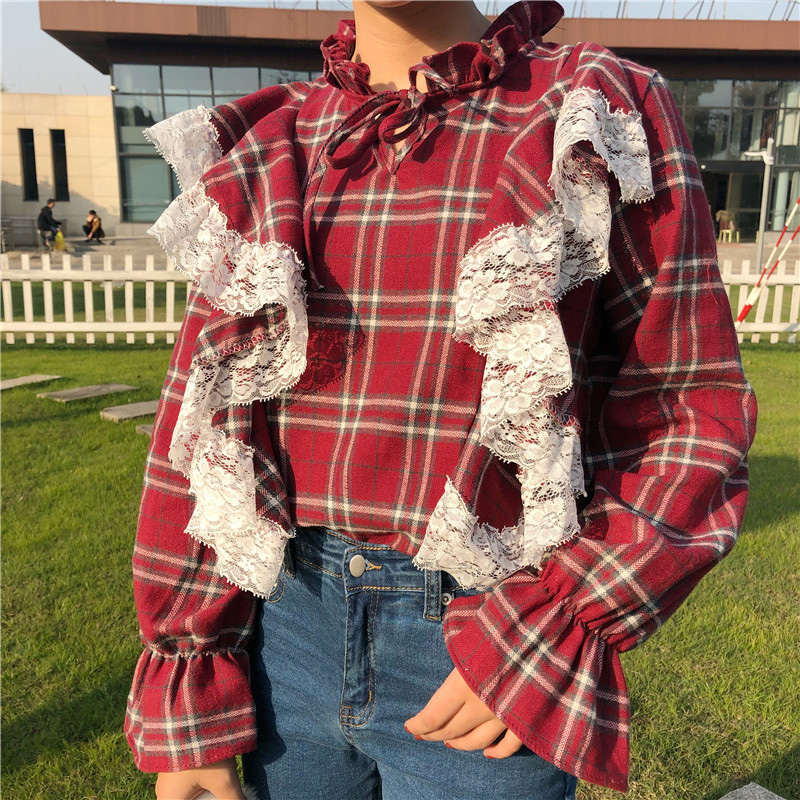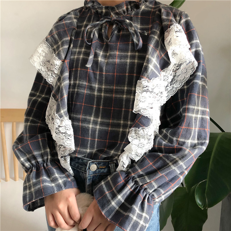 / 少女蕾絲荷葉邊襯衫2018秋裝新款學生甜美可愛燈籠長袖格子上衣潮