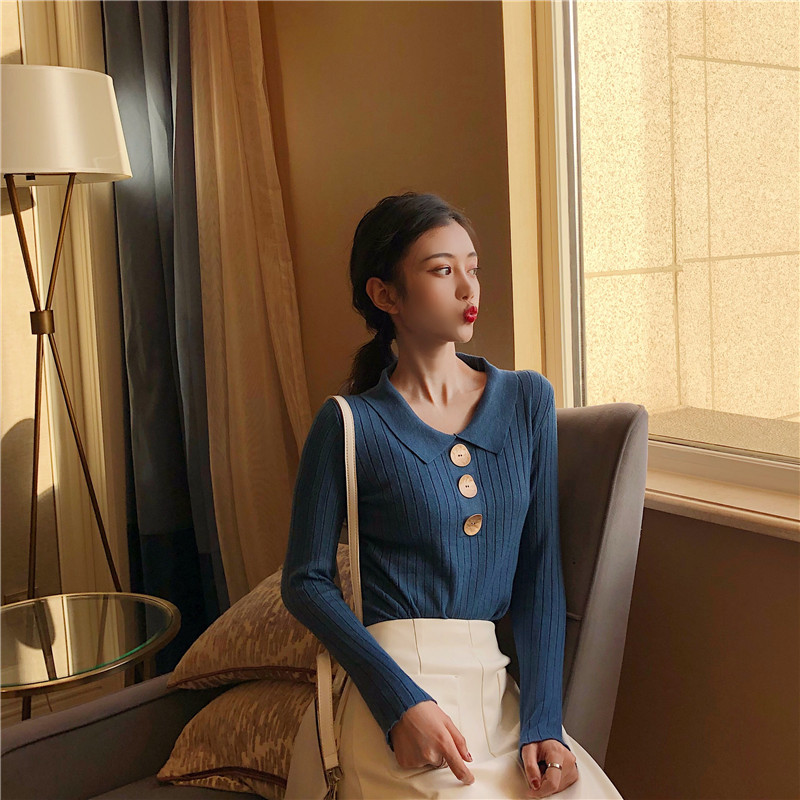 2018秋裝新款T恤女韓版修身顯瘦彈力翻領大紐扣針織外穿打底上衣