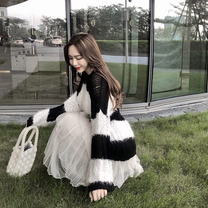 秋季套裝女時尚兩件套寬松長袖鏤空針織套頭慵懶條紋毛衣+蛋糕裙