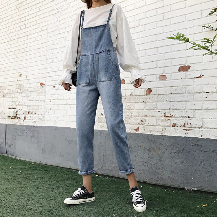 早春新款女裝直筒寬松顯瘦學生吊帶褲復古九分小腳背帶牛仔褲女