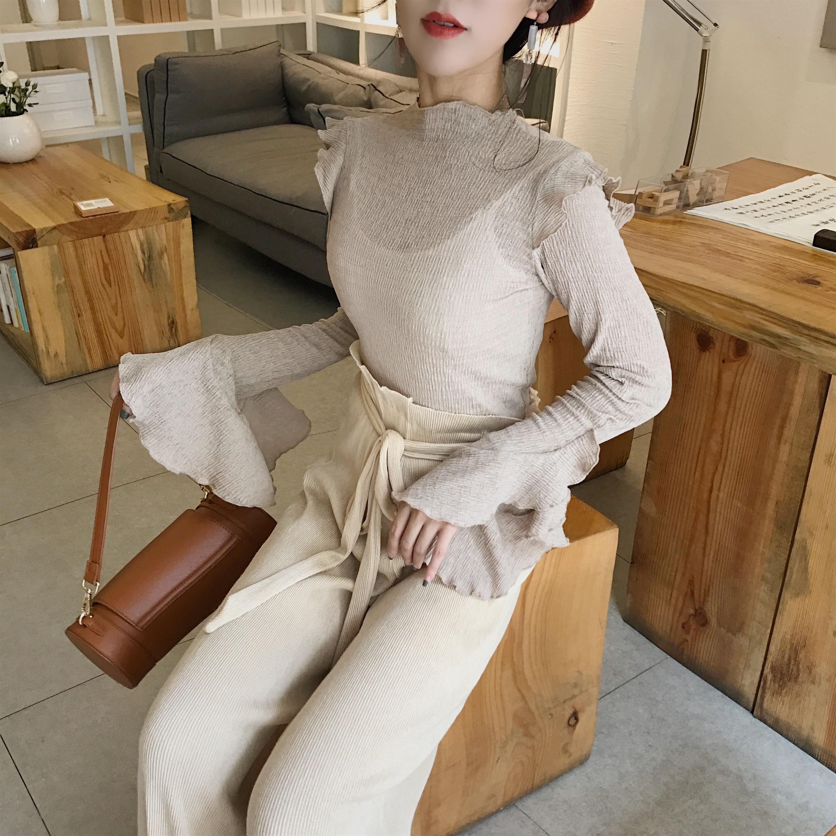 2018秋裝新款甜美復古chic彈力修身荷葉袖圓領韓版氣質百搭上衣女