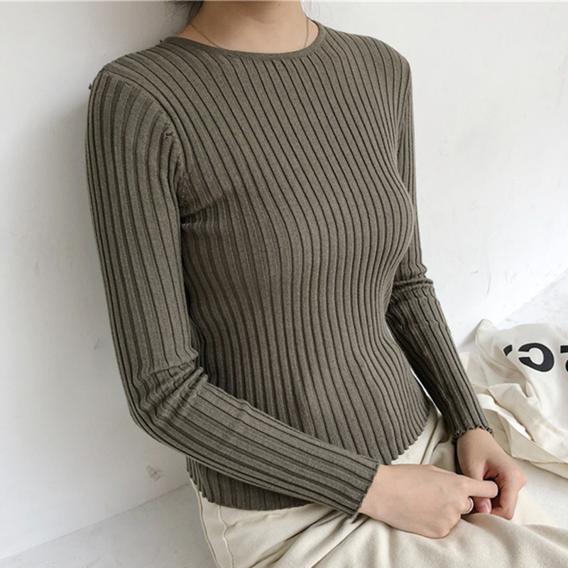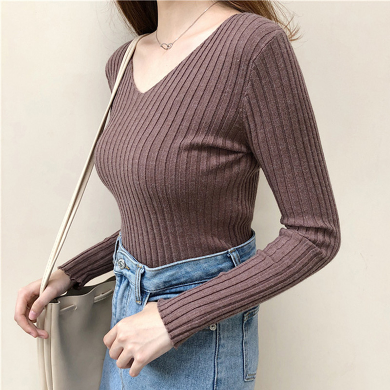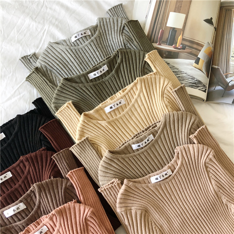 糖果色圓領長袖針織打底衫秋裝女2018新款韓版氣質V領修身短上衣