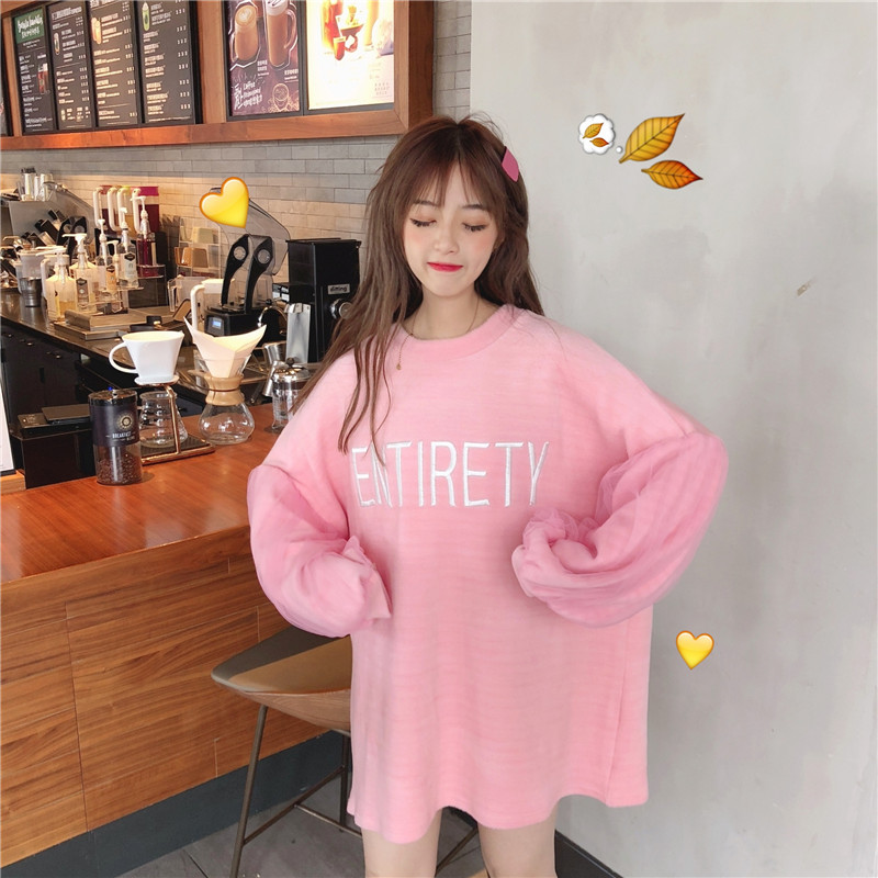 / 秋冬女裝韓版中長款慵懶風寬松字母刺繡網紗拼接套頭衛衣上衣外套