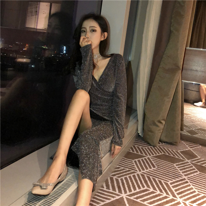 復古港味早秋顯瘦修身長裙新款百搭chic長袖V領性感氣質連衣裙女