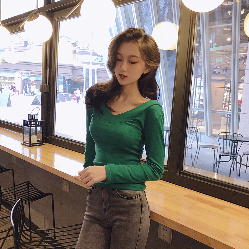 露背V領2018秋季新款長袖修身純色顯瘦復古打底chic百搭T恤上衣女