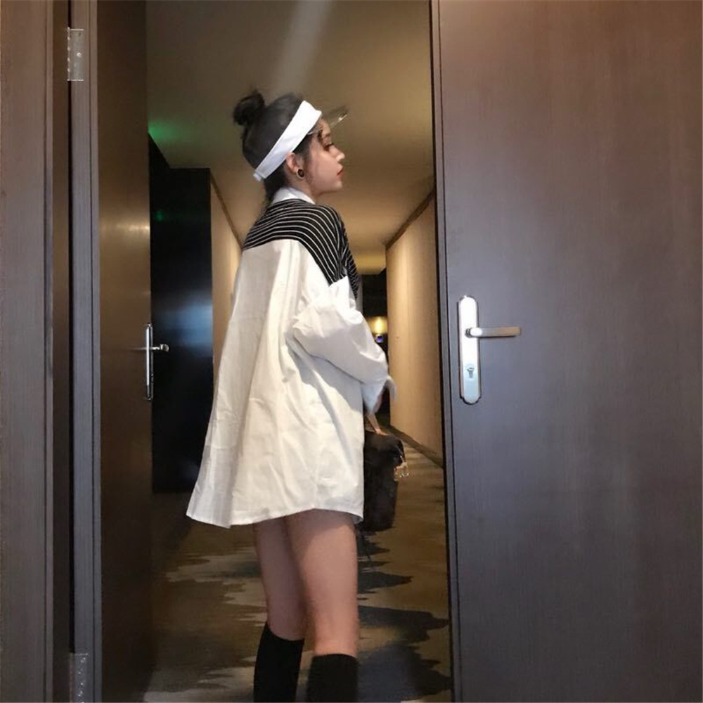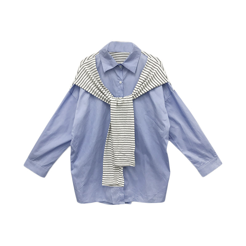 / 韓版時尚秋裝女2018新款港味條紋披肩拼接長袖寬松純色百搭襯衣潮