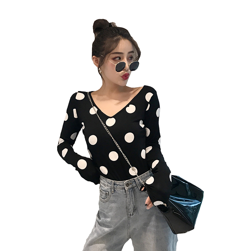 / 時尚百搭復古2018秋裝新款韓版上衣女港味V領波點打底顯瘦長袖T恤
