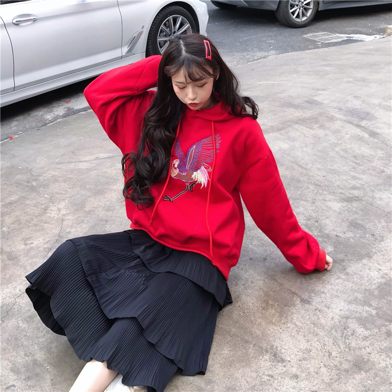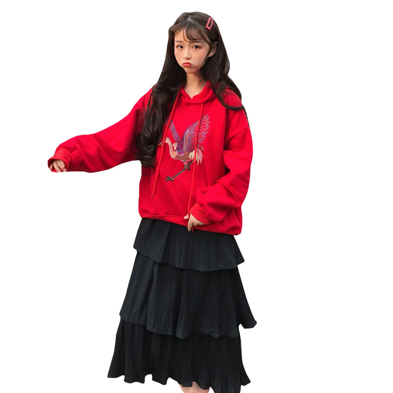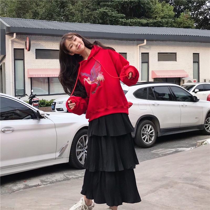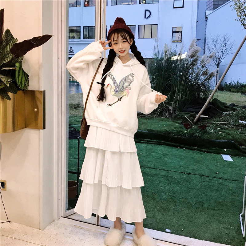 / 韓版時尚休閑套裝秋季女裝刺繡加絨連帽衛衣+蛋糕裙半身裙兩件套