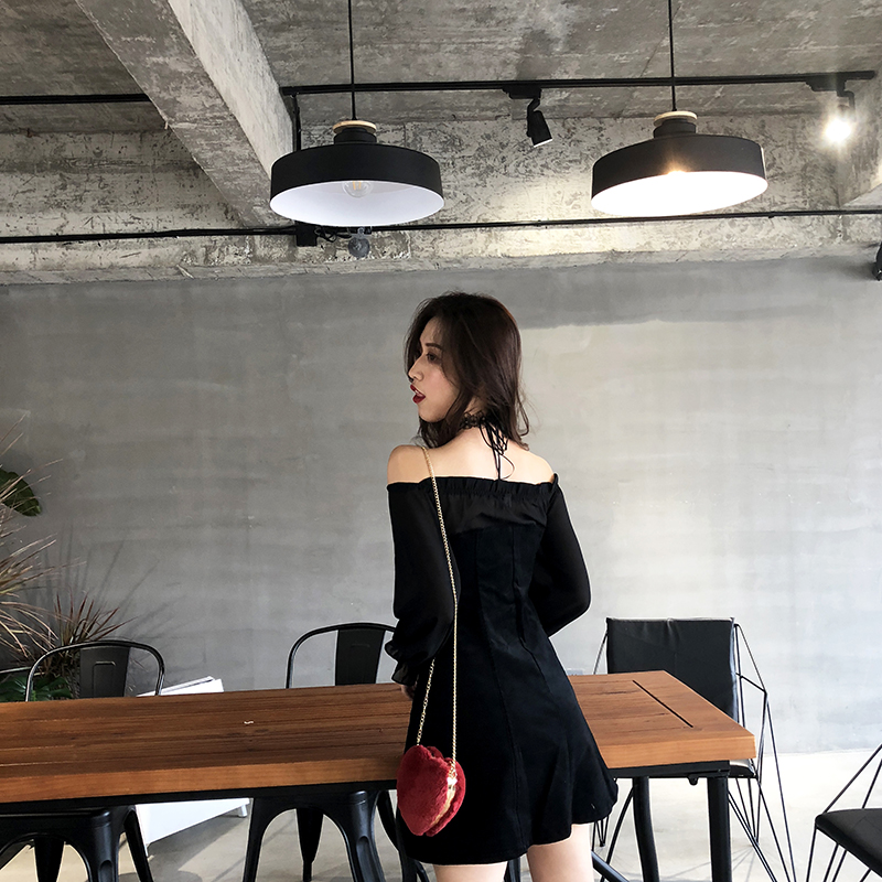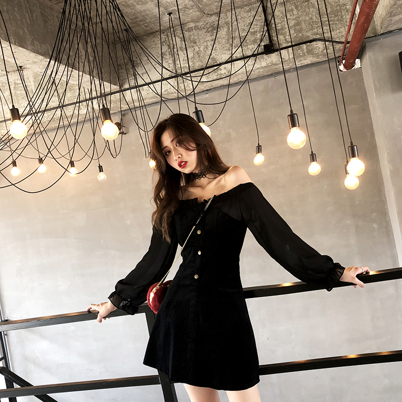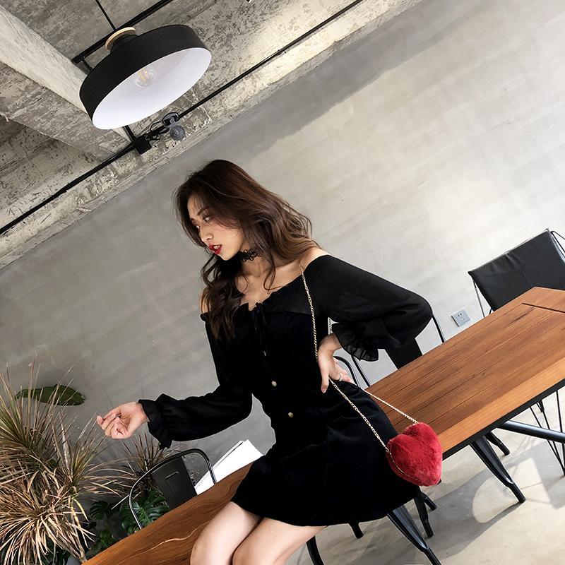 秋裝女2018新款氣質拼接長袖chic裙子復古韓版一字肩絲絨連衣裙潮