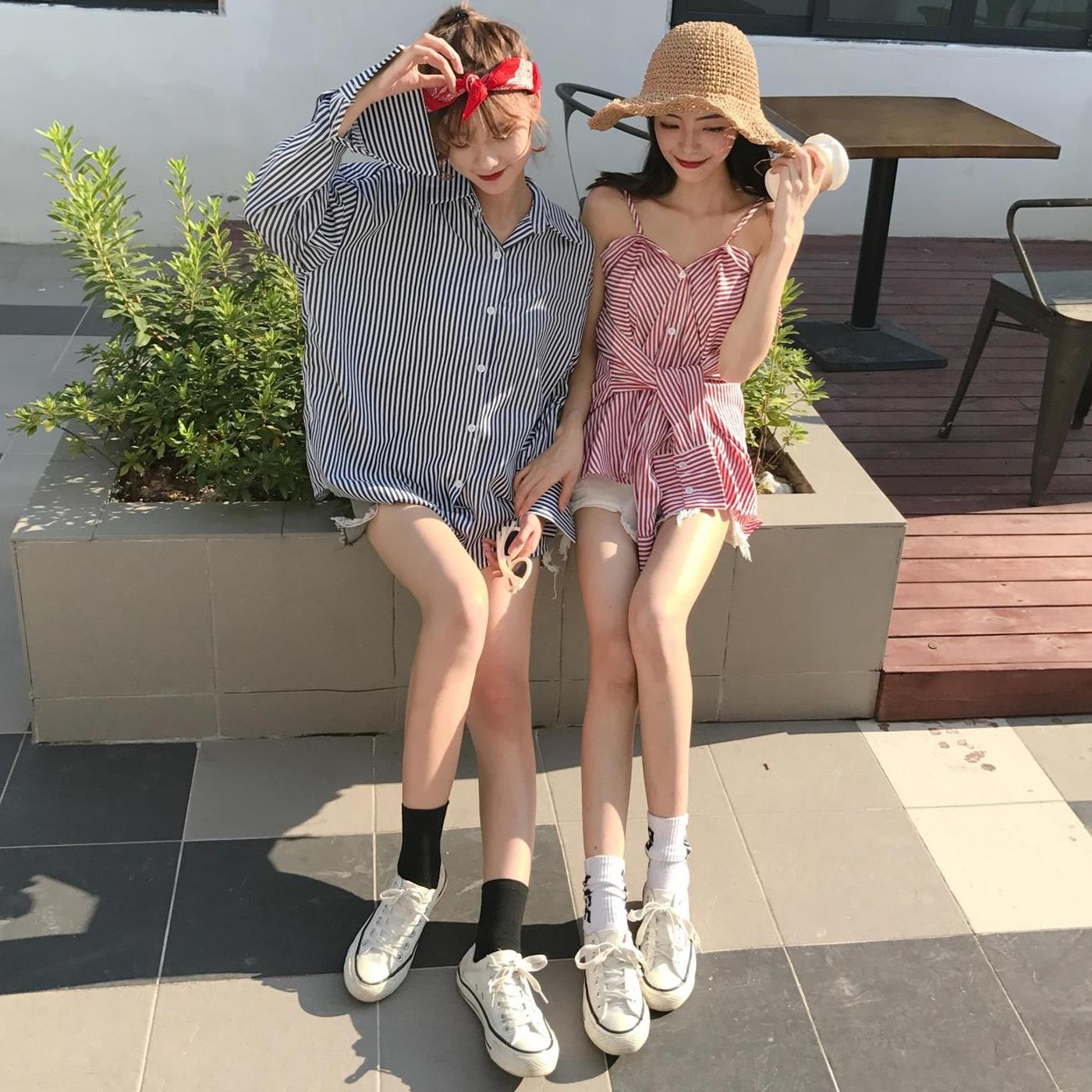 / 條紋長袖女襯衫學生韓版chic寬松顯瘦百搭一字領露肩吊帶多穿上衣