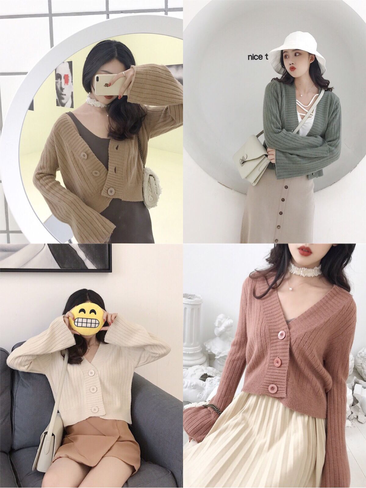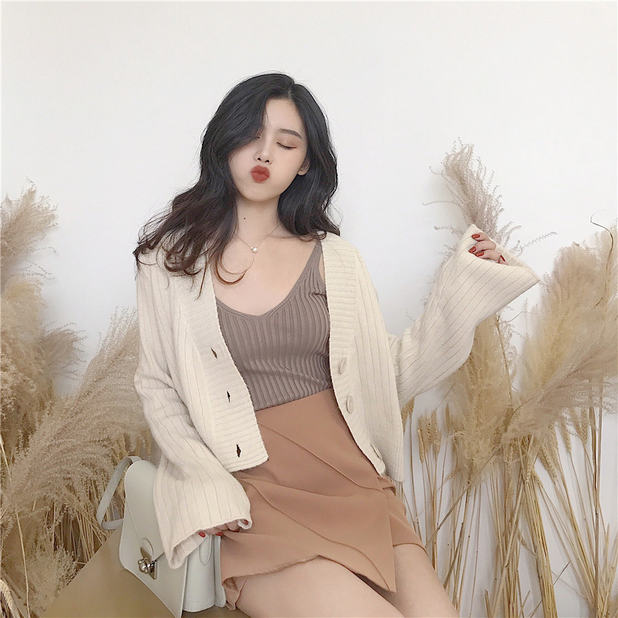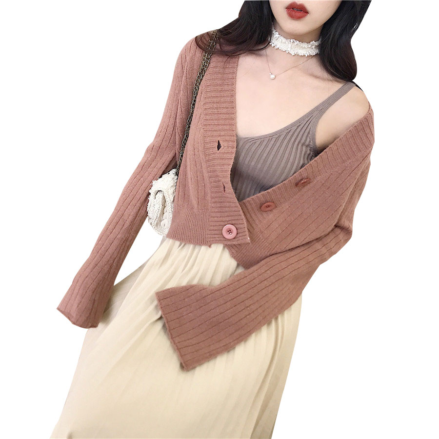 韓版chic早秋慵懶溫柔毛衣坑條V領一排扣喇叭袖純色百搭針織開衫