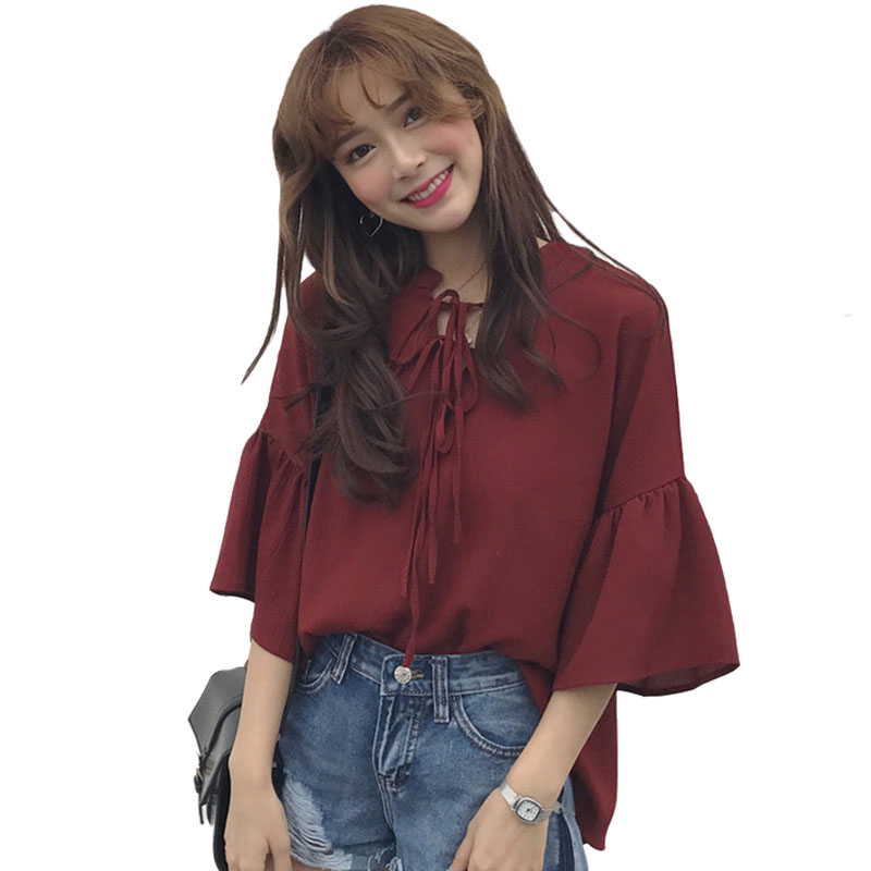 / 春夏女裝韓版復古百搭領口系帶襯衣寬松喇叭袖短袖雪紡衫襯衫上衣