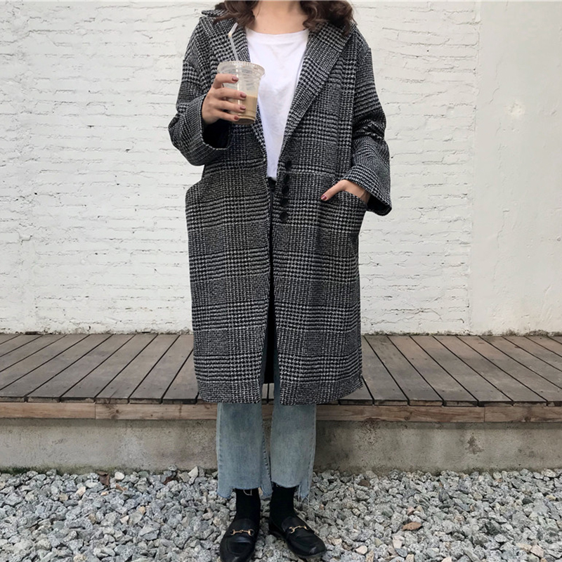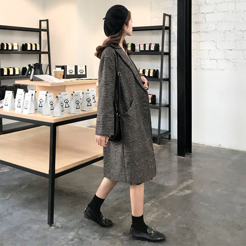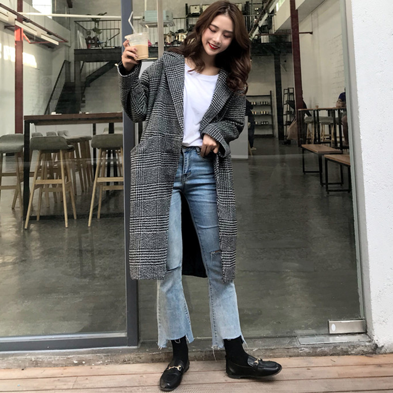 2018流行毛呢外套女秋冬裝新款赫本大衣翻領格子風衣中長款開衫潮