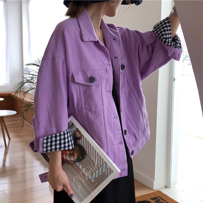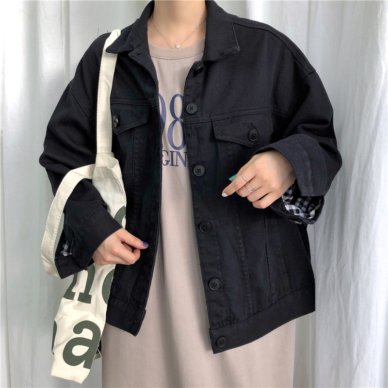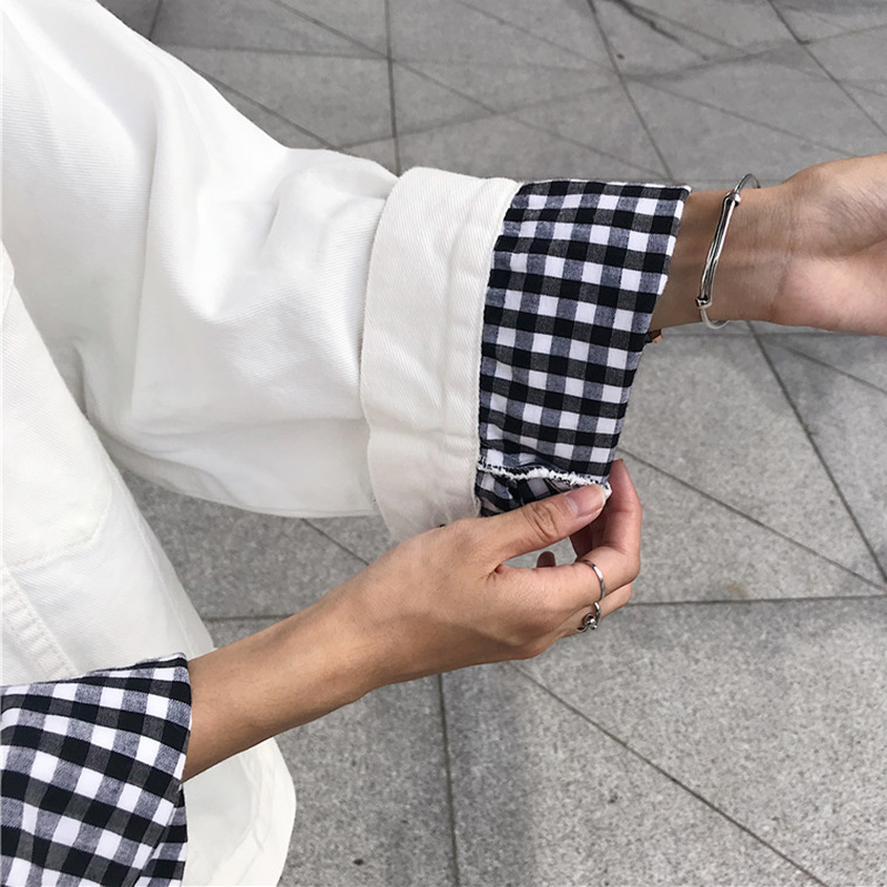/ 復古格子拼接牛仔外套秋冬女裝新款學生翻領寬松長袖夾克開衫上衣