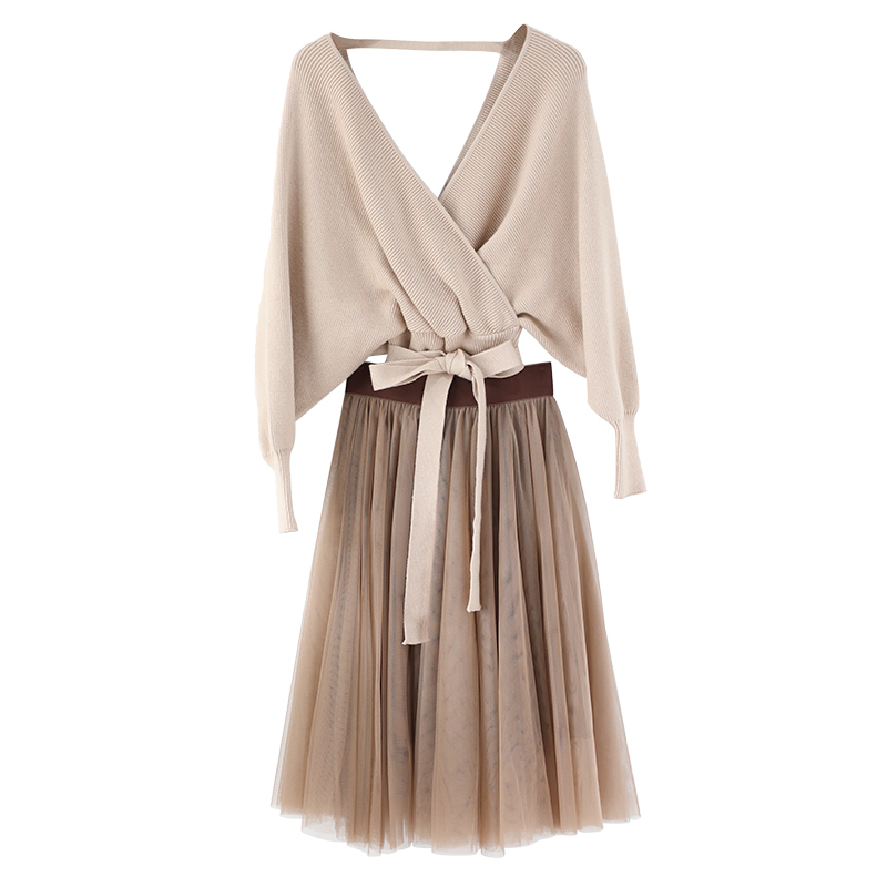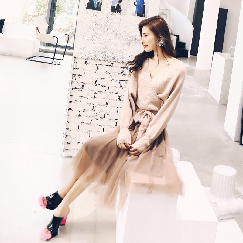 慵懶風連衣裙女兩件套2018秋新款網紗半身裙針織衫寬松毛衣套裝潮