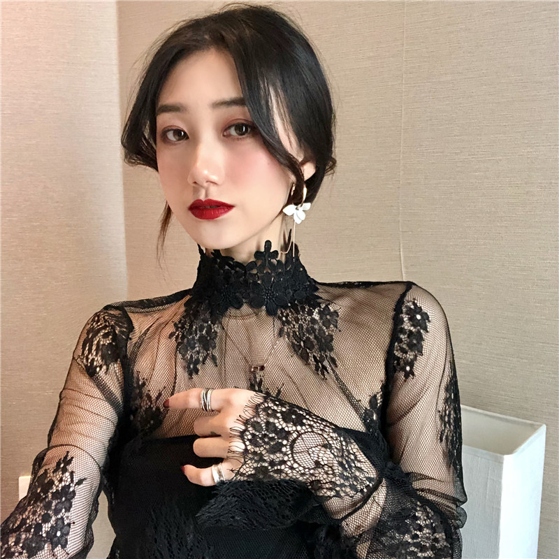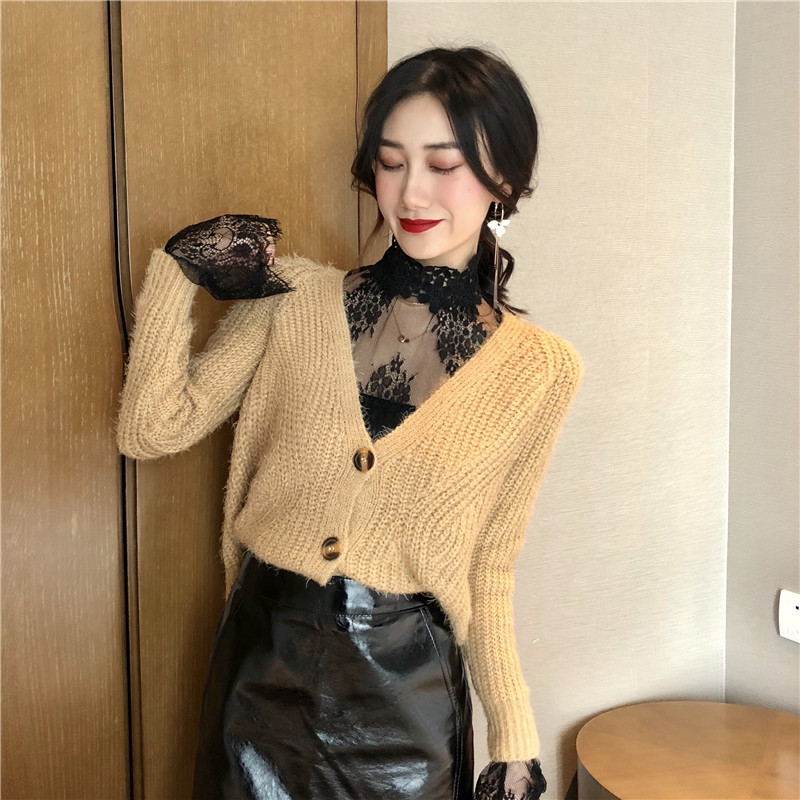 / 秋冬新款立領蕾絲花朵透視薄款內搭打底衫毛衣開衫港風時尚套裝女